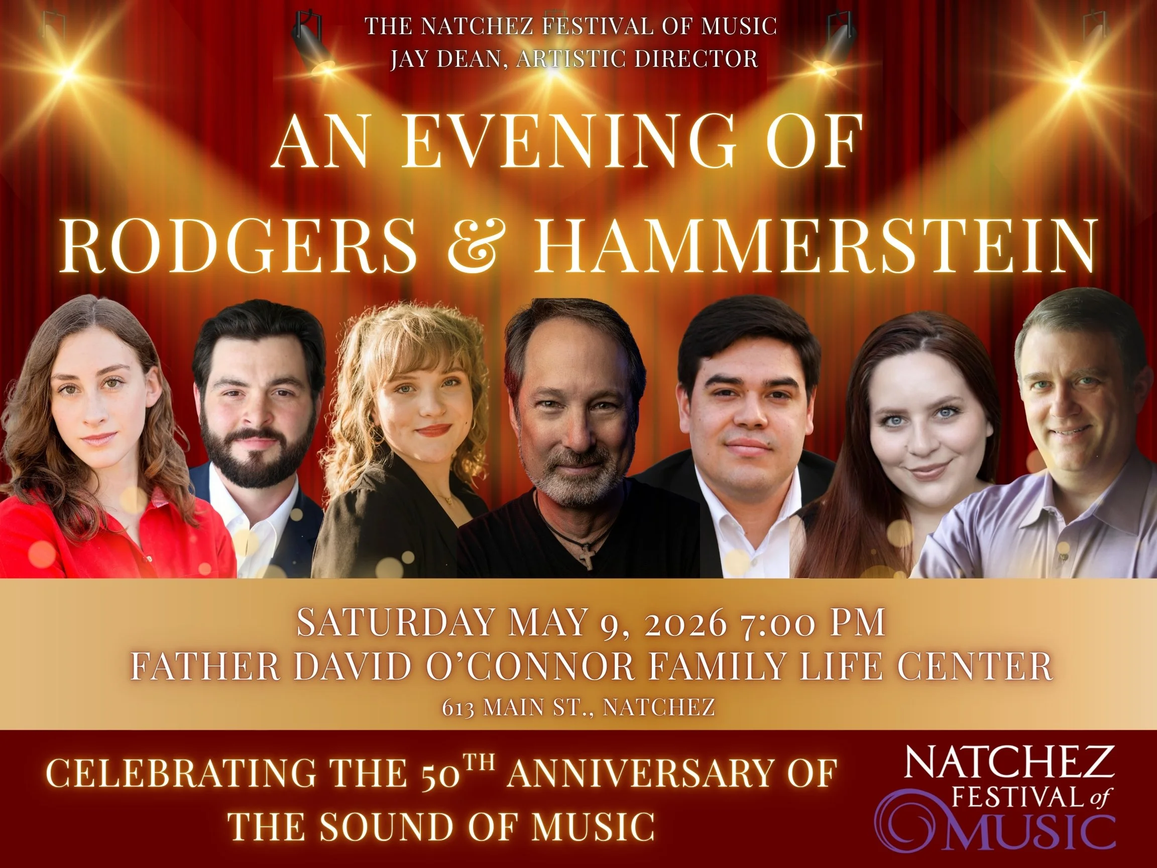 The Natchez Festival of Music is pleased to welcome back bass-baritone Paul Houghtaling who first appeared in Natchez in 1995 as Snoopy in You’re a Good Man Charlie Brown. He has returned in a variety of Natchez productions with Jay Dean in recent years, and he is excited to bring An Evening of Rodgers and Hammerstein to the stage. Paul has enjoyed a 40-year career as a performer and stage director and has garnered critical acclaim in a wide variety of repertoire. He will be joined by his long-time pianist and collaborator Kevin Chance and five young artists from the University of Alabama, where he has developed an award-winning training program. Kevin is the current President of the Music Teachers National Association and has collaborated with singers and instrumentalists all across the world, including recent concerts in Peru and Mexico, and he has recorded on the Centaur label. Soprano Zoe Rose Pallas made her Lincoln Center debut last year with Teatro Nuovo and sang the title role in Puccini’s Suor Angelica with Birmingham Opera Project. Shelby Stephens, soprano, has been heard a great deal in her native Kentucky and mezzo-soprano Anna Sophia Jones is a graduate of the University of Central Arkansas. Tenor Joshua Jones just completed a summer with Central City Opera and was as Encouragement Award winner in the Metropolitan Opera Laffont Competition. Benjamin Somervell was a finalist in the National Opera Association Vocal Competition and is a favorite of Opera in the Ozarks. Paul looks forward to sharing the talents of these rising stars with the Natchez audience and to singing some songs of Captain Von Trapp for the very first time.